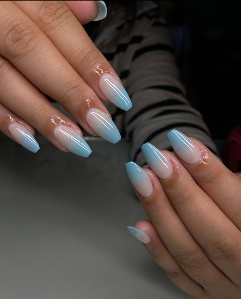 Minimalists will love this clean design. The nails feature a soft gradient from milky nude to powdery blue tips.