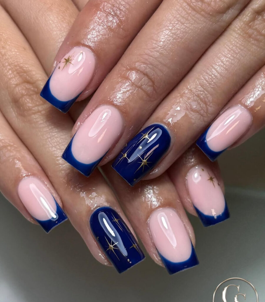 This design feels magical without being over the top. The look combines deep navy French tips with tiny gold star accents.