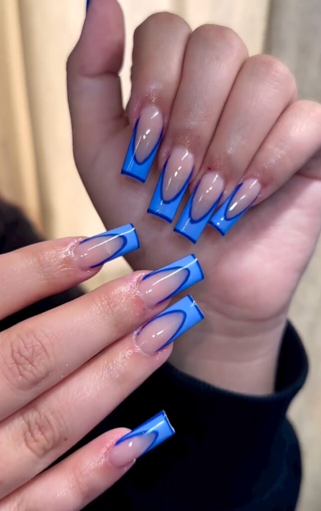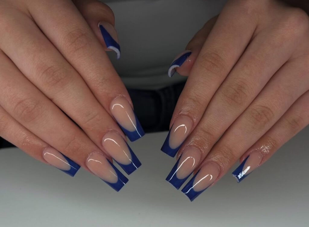 If you love modern nail designs, this one feels super fresh. The look features a medium blue French tip outlined with thin dark blue V shapes.