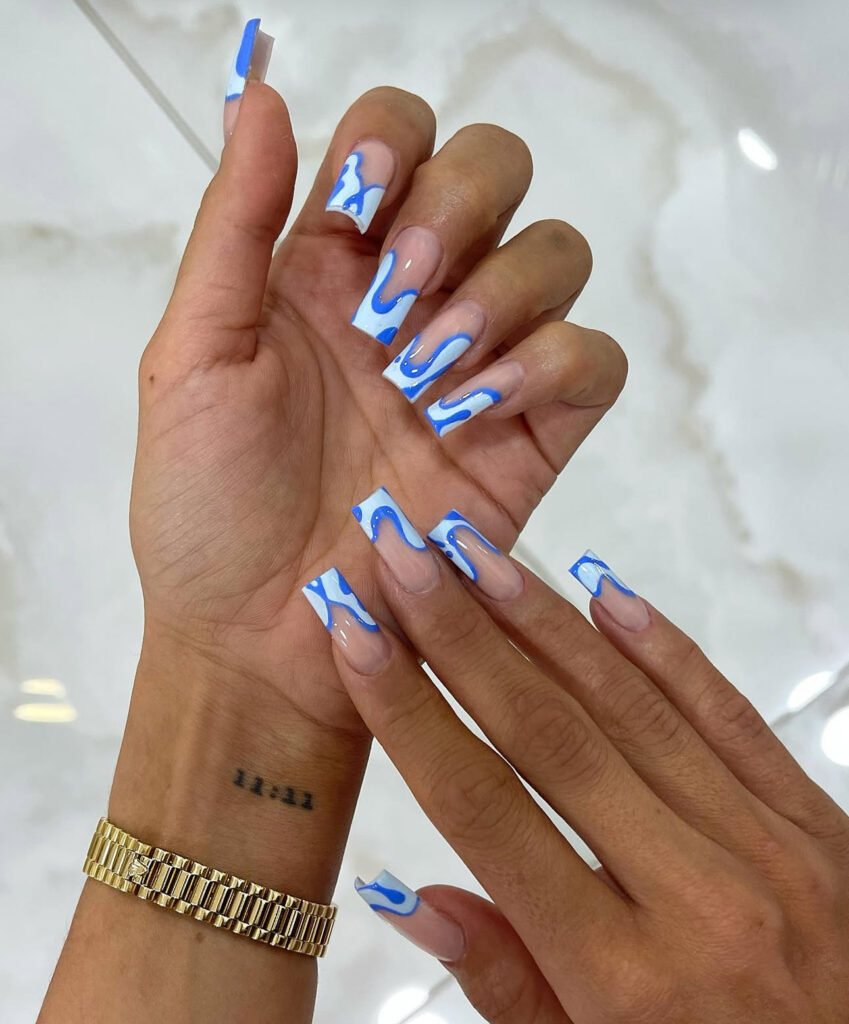 Swirl designs always feel artistic. This manicure features blue and white wavy swirl patterns across the tips.