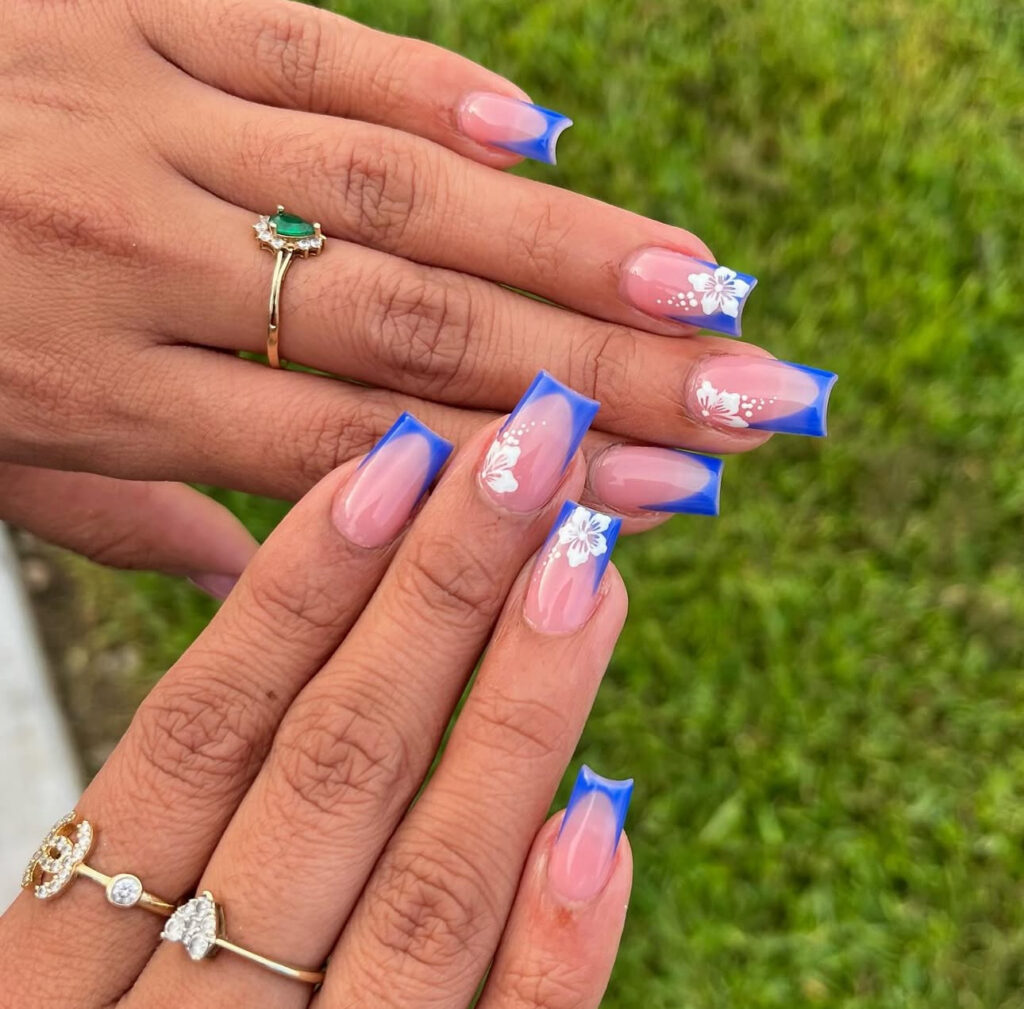 This design blends deep royal blue French tips with delicate white floral patterns.