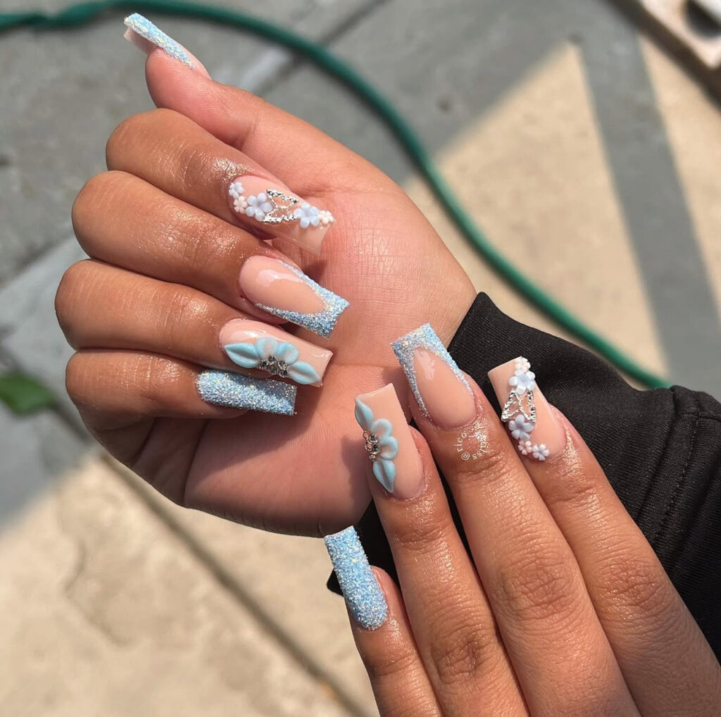 This look takes a slightly more decorative approach to simple blue nails. The design combines light blue glitter tips, 3D flowers, and butterfly charms over a nude base.