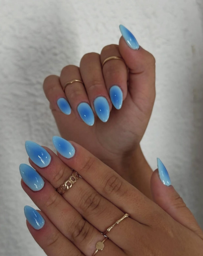Aura nails feel trendy right now, and honestly, I understand the hype. This design features a deep cerulean center fading into a pale sky blue edge, creating a soft glowing effect.