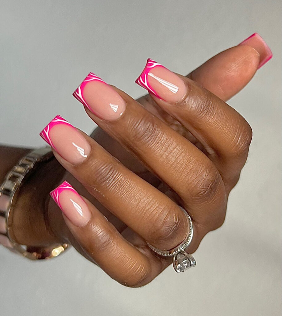 These long square nails feature hot pink French tips decorated with intricate white marble detailing.