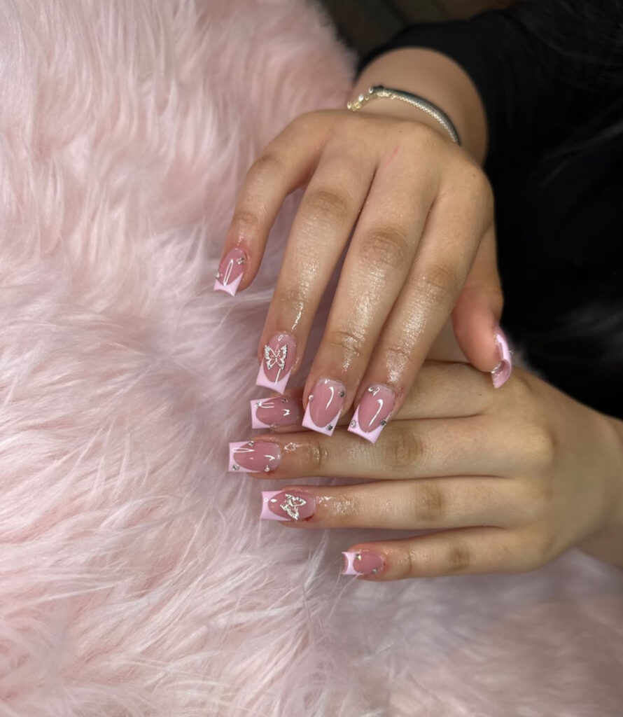 These square nails combine pink French tips with rhinestones and delicate silver butterfly charms.
