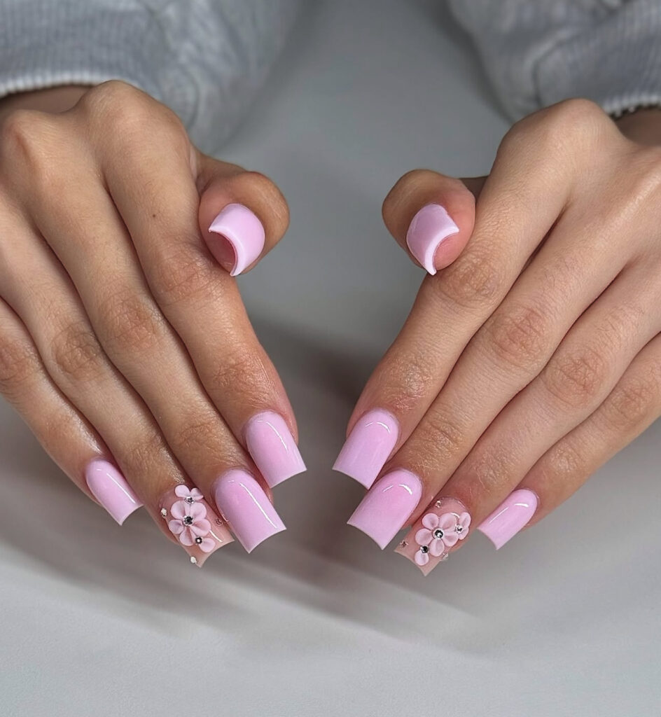 These square nails feature a glossy baby pink polish with 3D floral charms and rhinestones on the ring fingers.