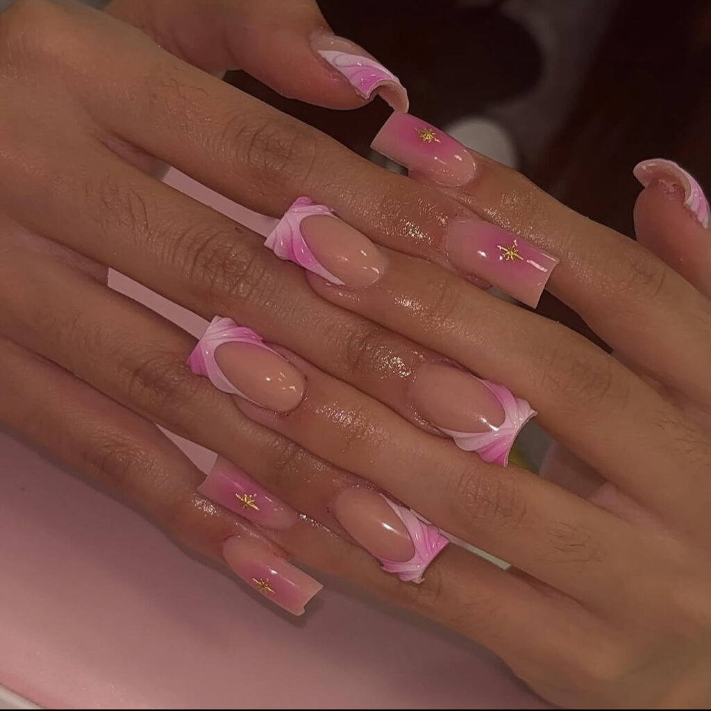 These nails combine pink swirled French tips, ombre accent nails, and tiny gold star charms.