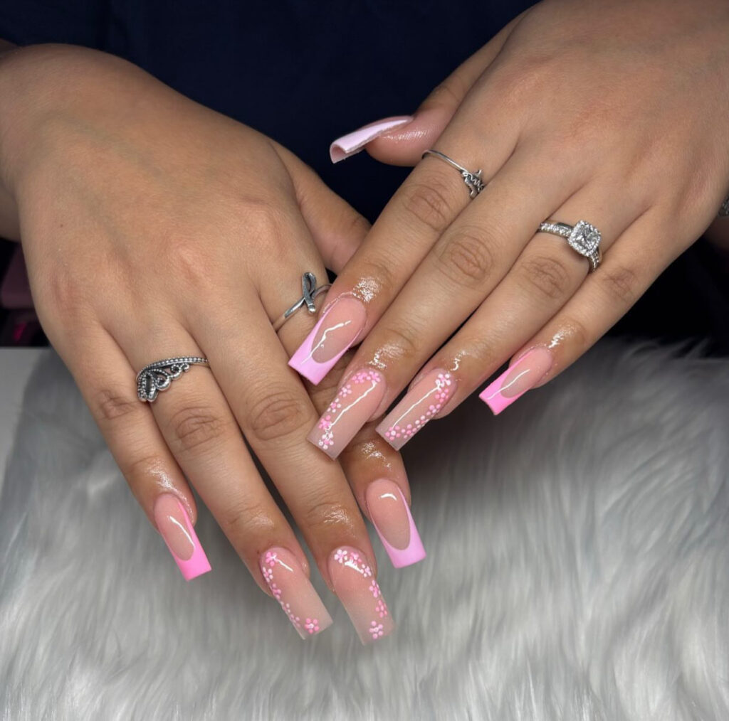 These long square nails feature pink French tips paired with tiny floral dot patterns on a nude base.