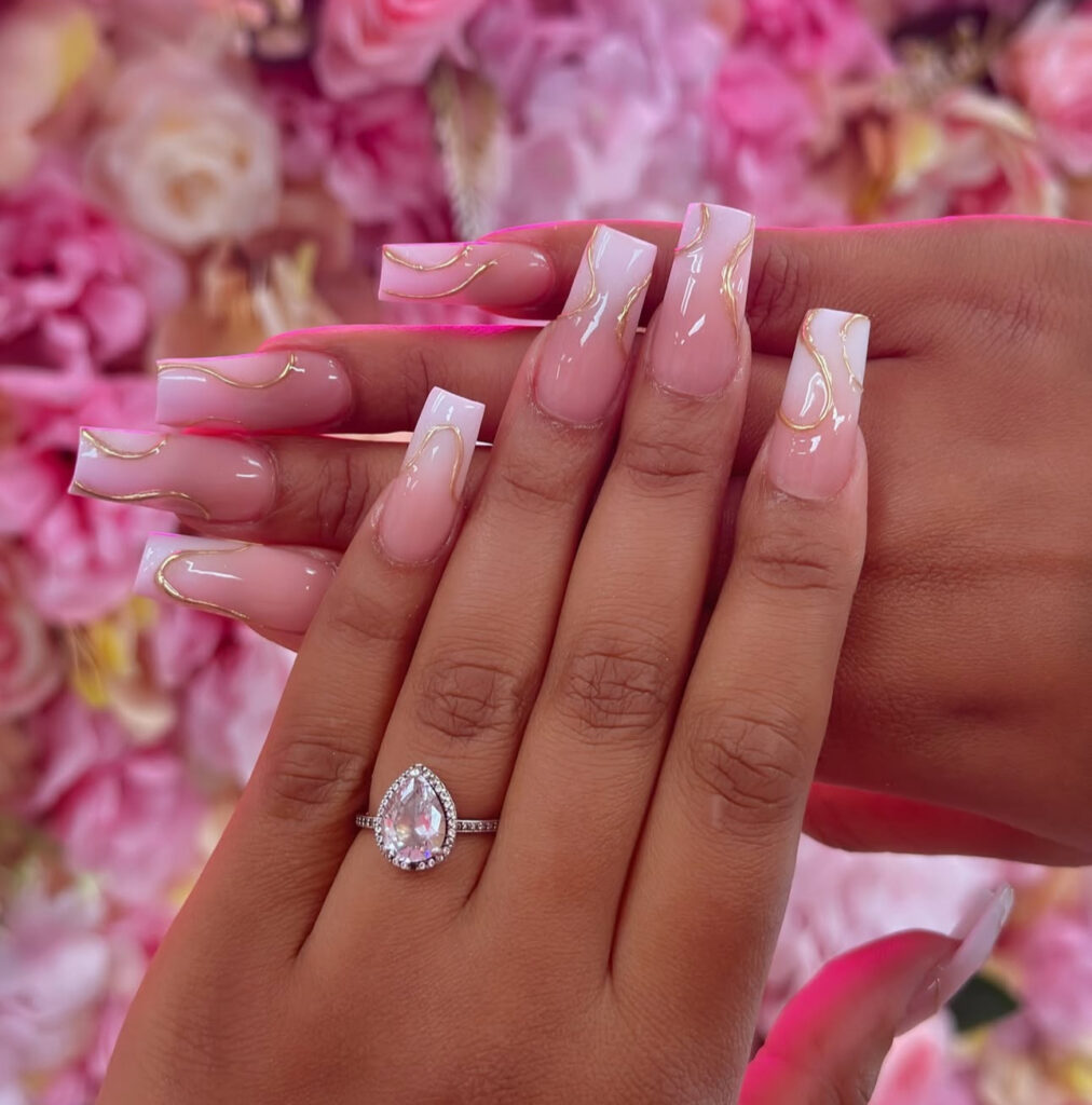 This design blends a soft pink to white gradient with gold chrome swirl accents.
