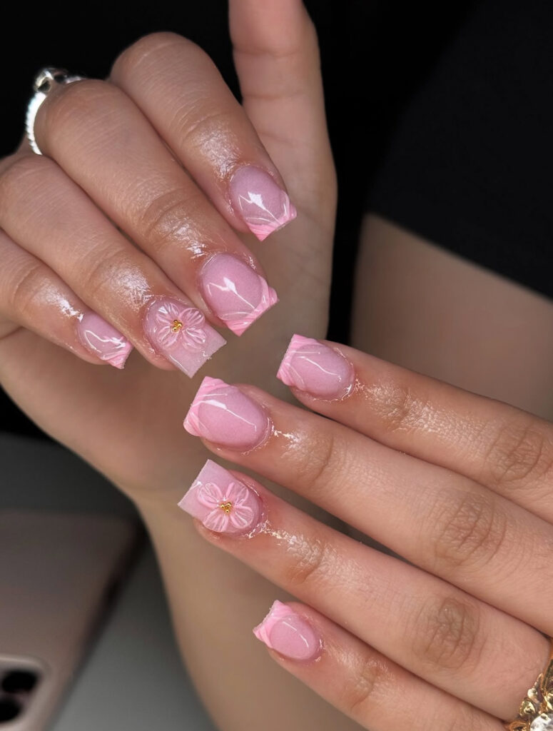 These short square nails feature a soft pink base with 3D flower accents and elegant white line details.