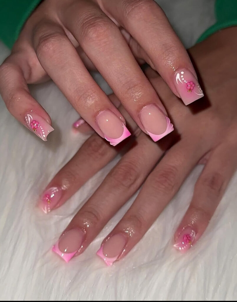 These nails feature bright pink French tips decorated with delicate floral accents, white swirls, and dot details.