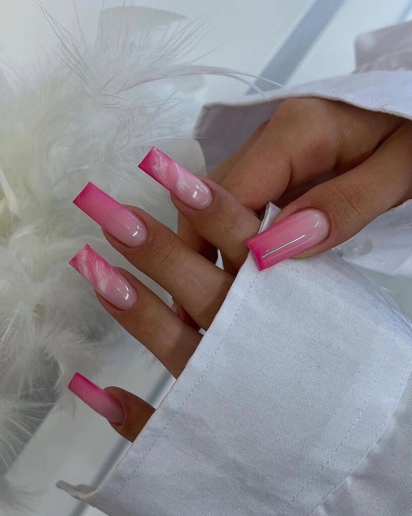 These nails feature a hot pink to nude ombre effect with delicate white marble swirls. The combination creates a bold but polished appearance.