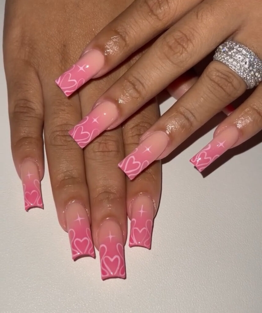These long square nails showcase a vibrant pink airbrushed ombre paired with white heart outlines and tiny sparkle stars. The look feels dreamy and nostalgic.