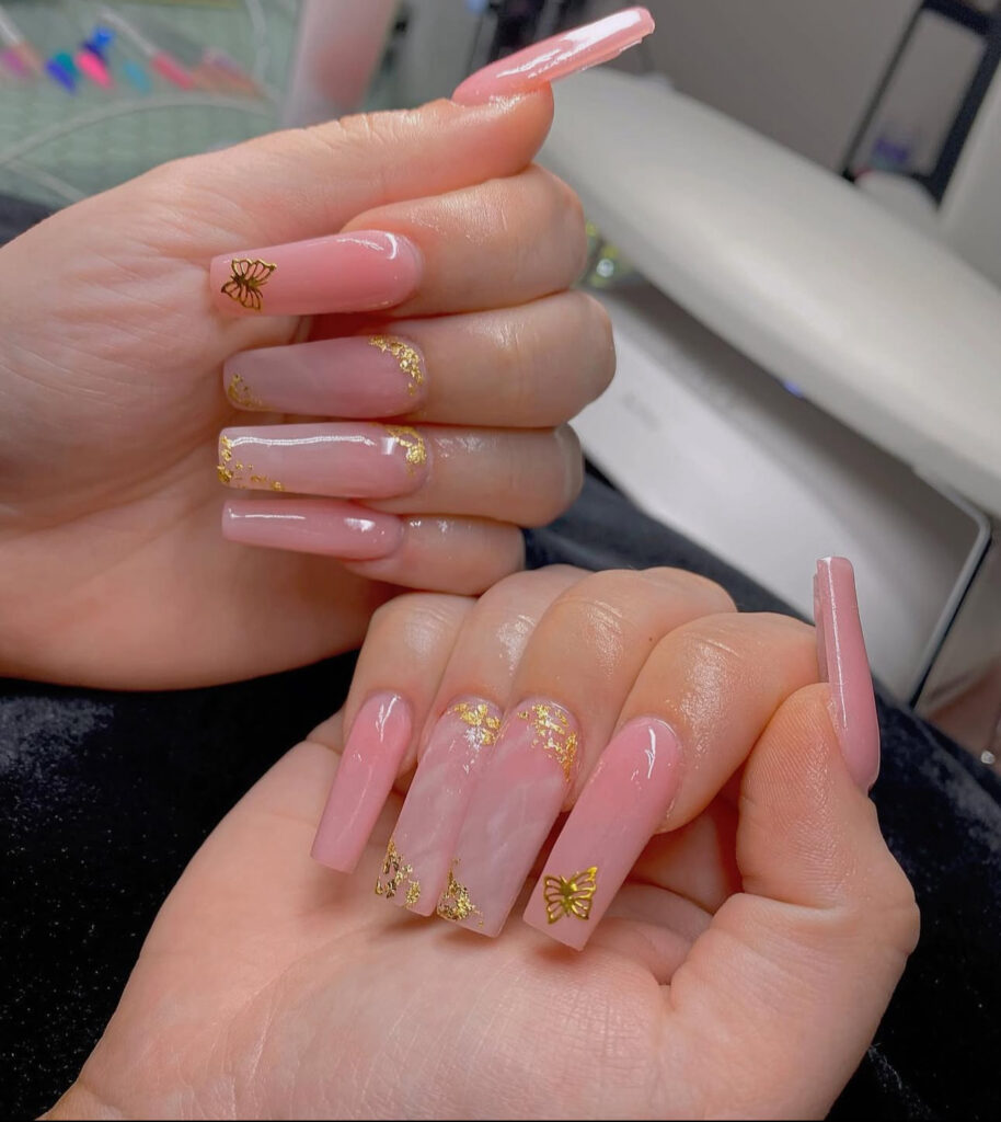 This design features a translucent jelly pink base with gold foil accents and butterfly decals. The result looks soft, dreamy, and slightly ethereal.