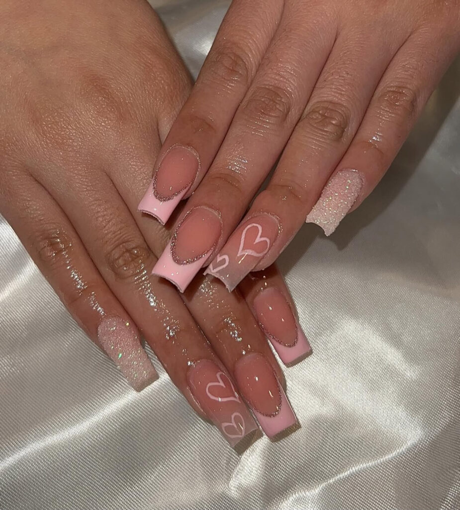 These long square nails feature pink French tips outlined with glitter, paired with hand painted hearts and sugar textured accent nails. The mix of sparkle and texture creates a soft romantic vibe.