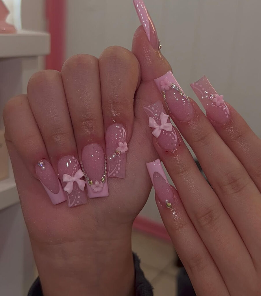 These long square nails feature a soft pink palette decorated with 3D bows, floral charms, rhinestones, and delicate white swirls. The result feels glamorous yet playful, almost like a modern coquette inspired manicure.
