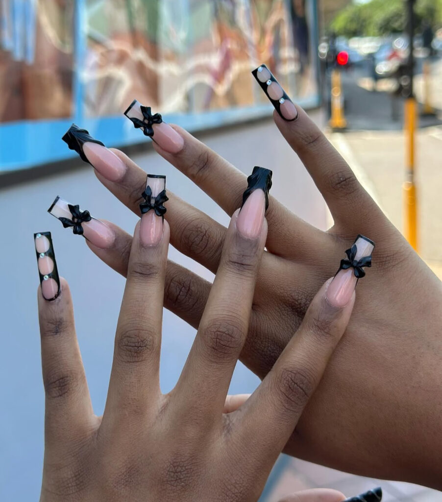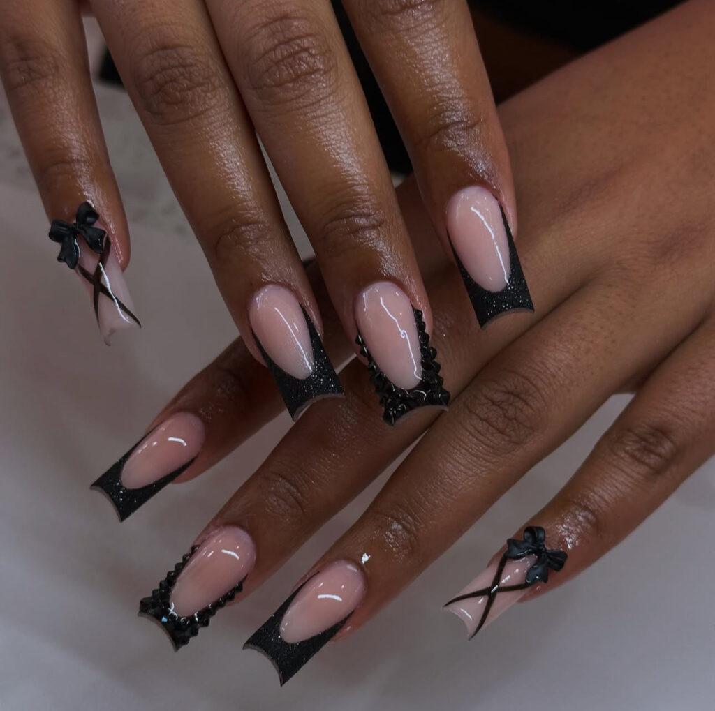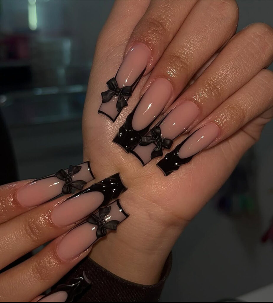 Long square nails with sleek black French tips, outline designs, cutout circles, and tiny 3D bows create a trendy, modern vibe.