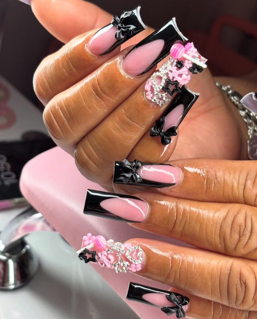 V cut French tips and black bows set the base. Then a maximalist accent nail loaded with pink lollipops, stars, and heart crystals steals the show.