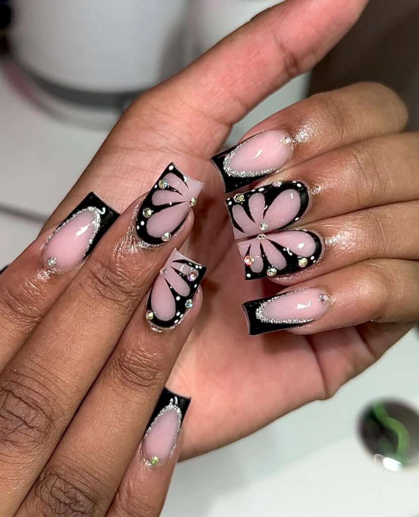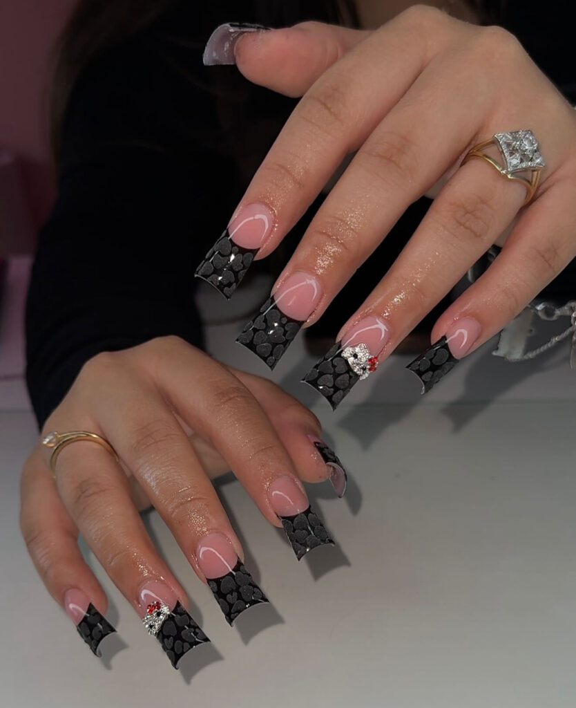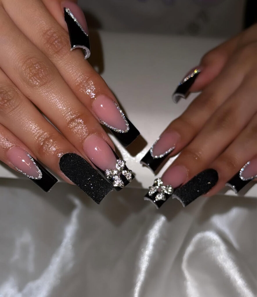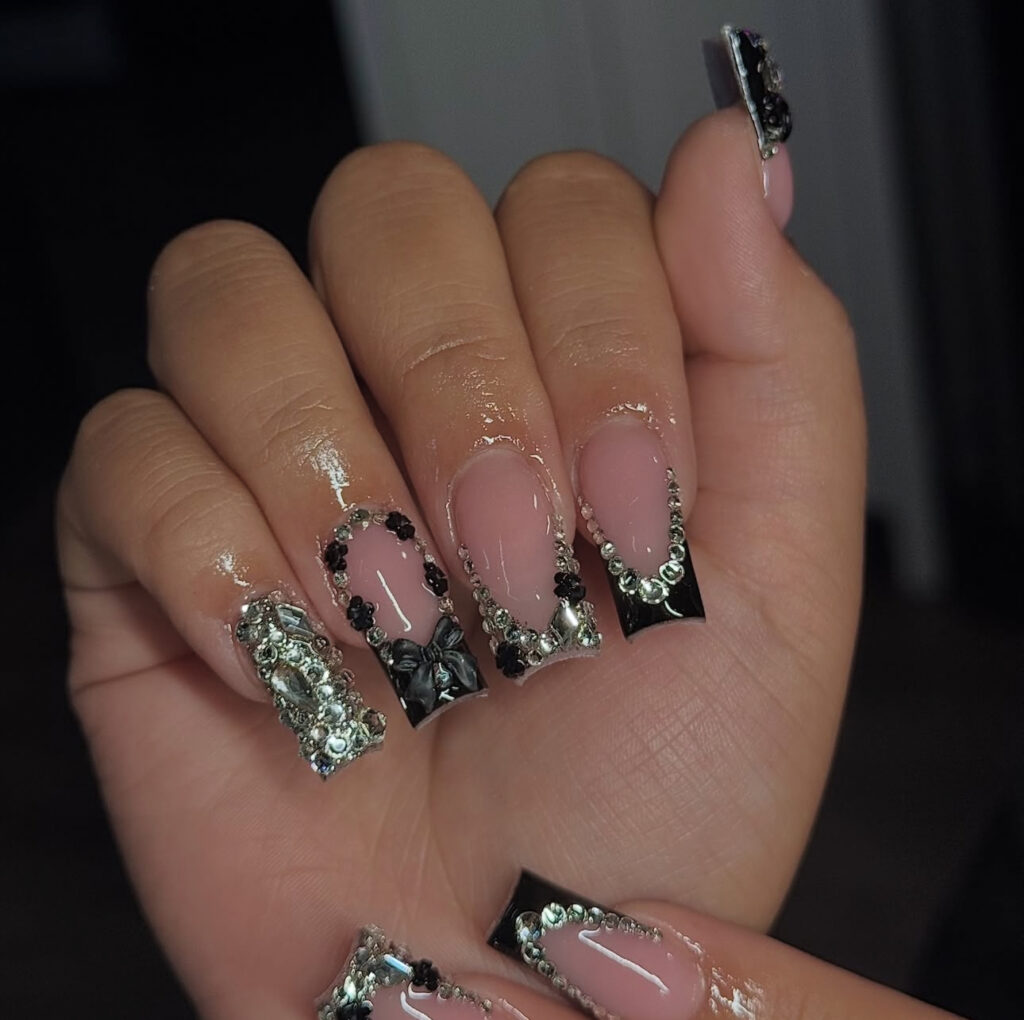 Square nails with black French tips already look elegant. But once you add dripping silver rhinestones, 3D bows, and a full crystal nail, you turn your hands into literal jewelry.