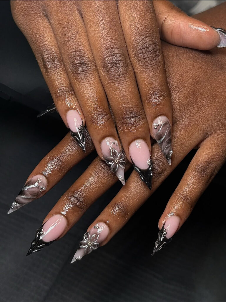 Add metallic silver flowers, liquid chrome swirls, and silver beads, and you get futuristic glam. This design feels bold and editorial.