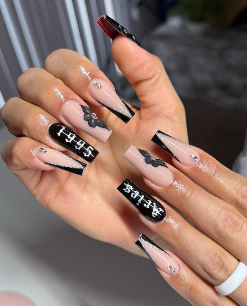 V-cut French tips, 3D floral charms, and bold gothic lettering showcasing “1995” and “Aries” turn your nails into a birthday statement.