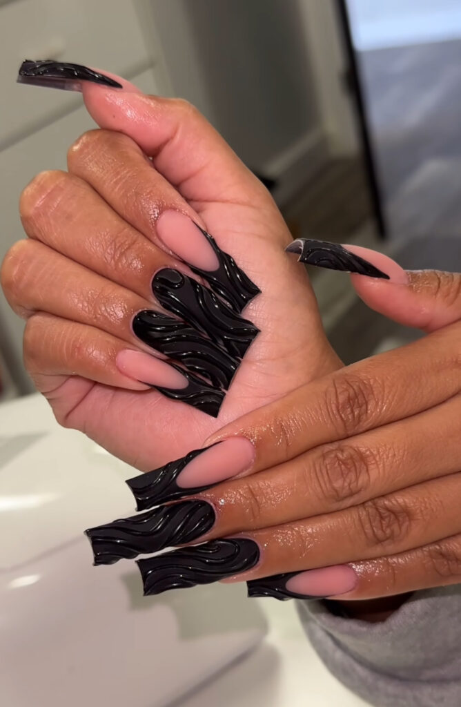 Long black French tips with glossy 3D wavy swirls create texture without extra charms. This monochromatic look feels modern and artistic.