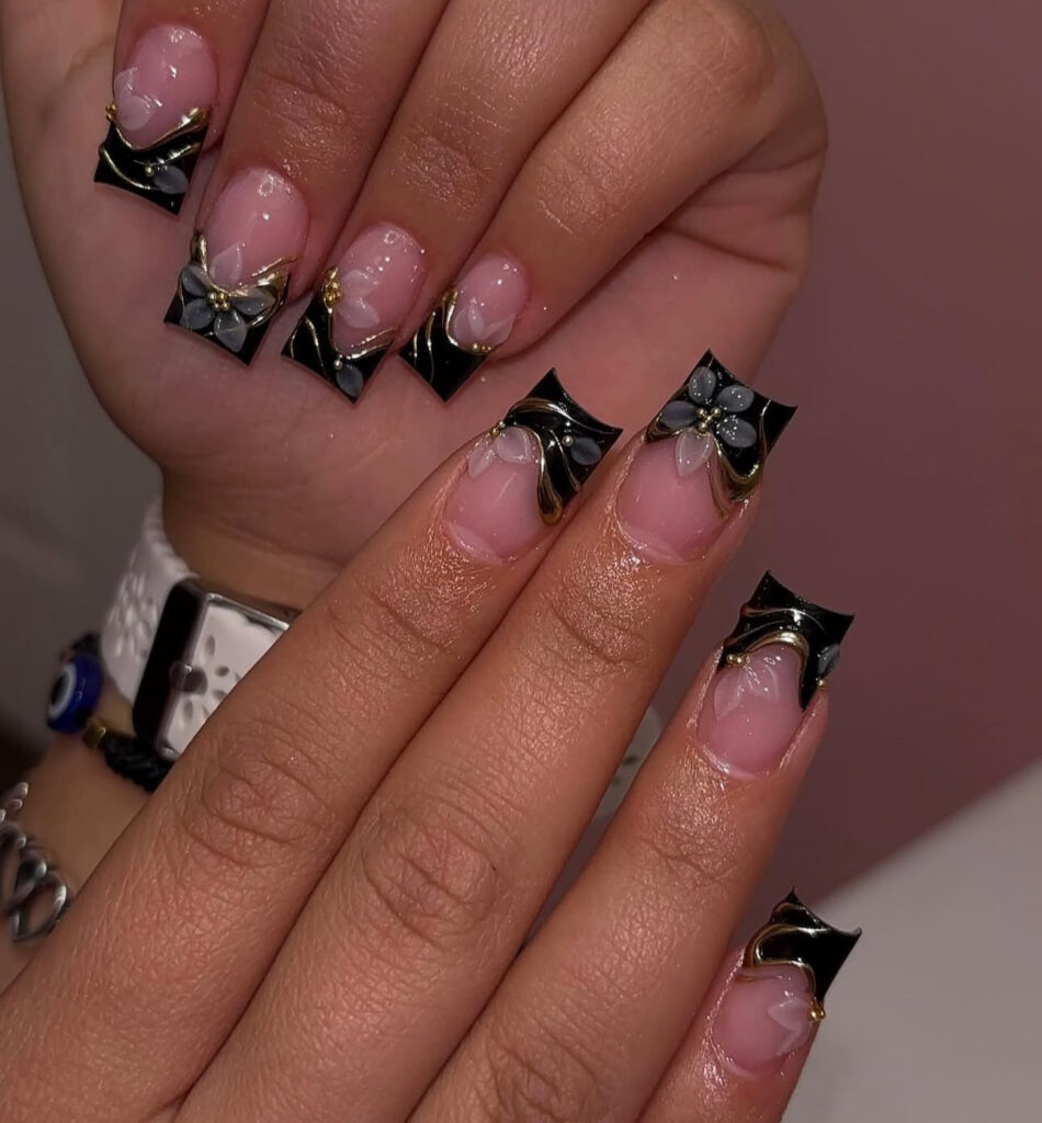 Add black French tips, translucent 3D flowers, gold swirls, and tiny gold beads, and you create a soft yet dramatic mix.