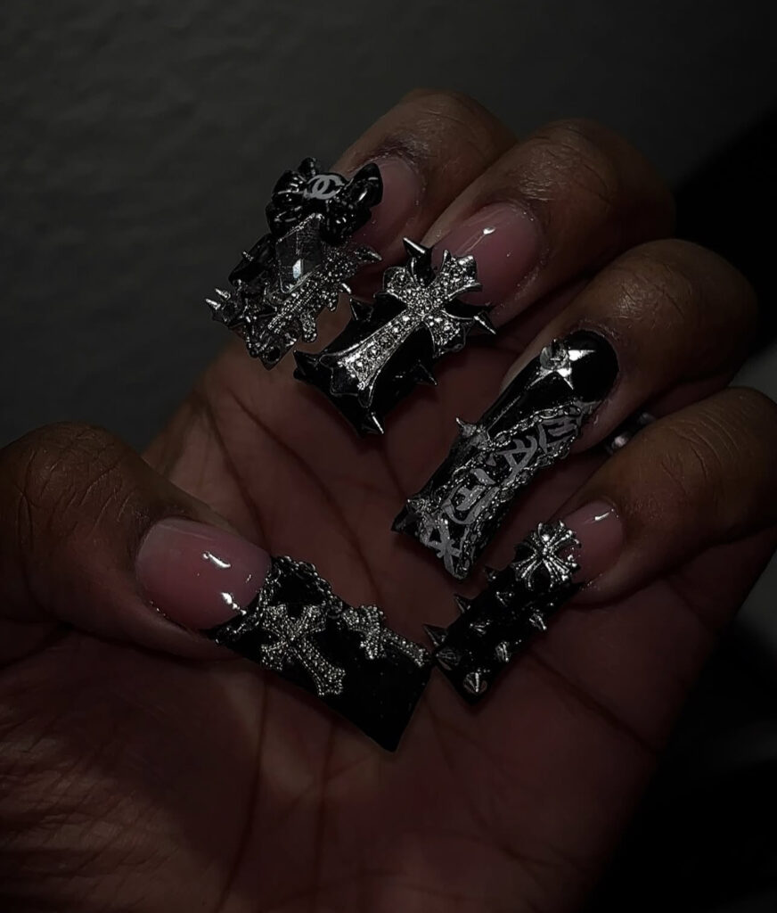 Large 3D chrome crosses, silver spikes, and designer inspired charms create bold birthday nails. This look works best if you love alternative fashion.