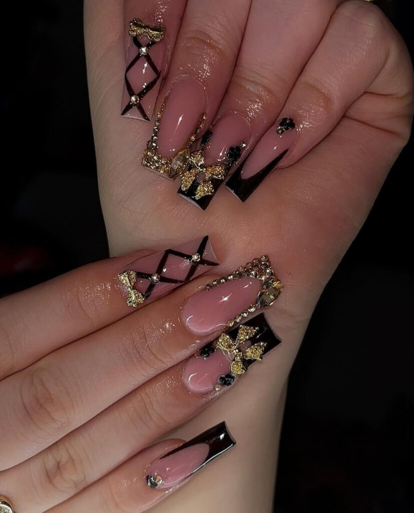 Long square nails with gold bow charms, corset style line work, and shimmering rhinestones create a high fashion look. This design feels rich.
