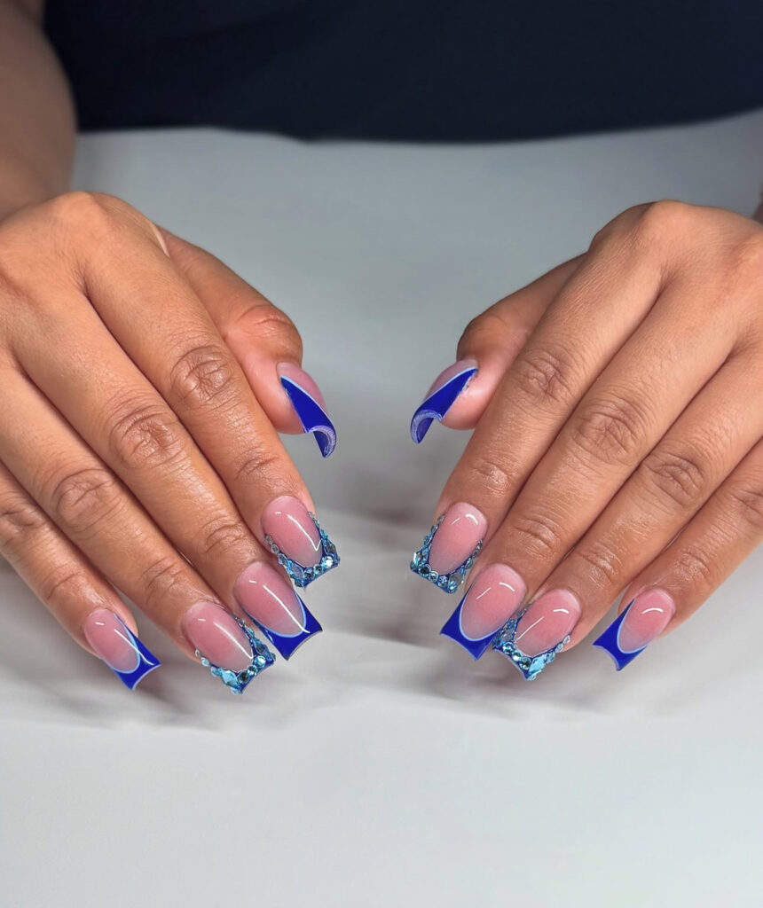 Deep blue French tips lined with rows of sparkling light blue rhinestones create a high-shine finish.