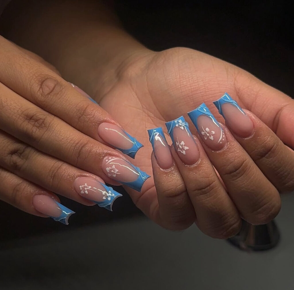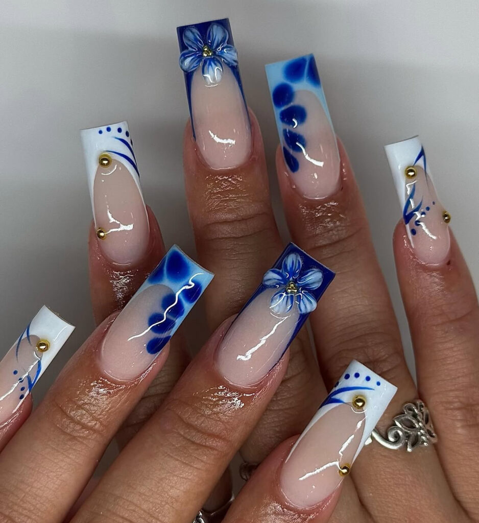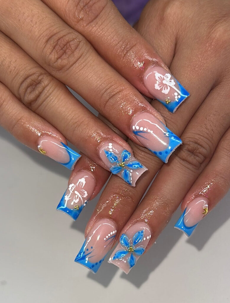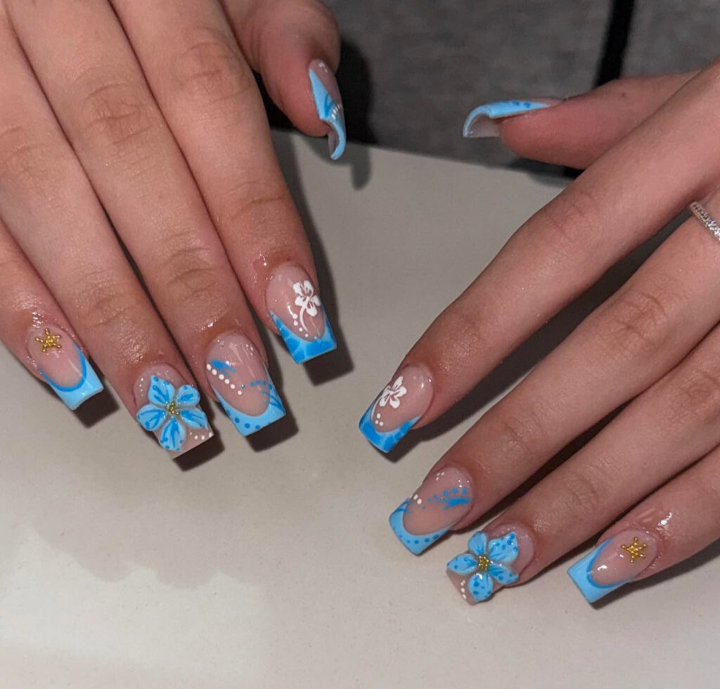 Vibrant blue French tips decorated with 3D white and blue hibiscus flowers and tiny gold accents feel tropical and luxurious.