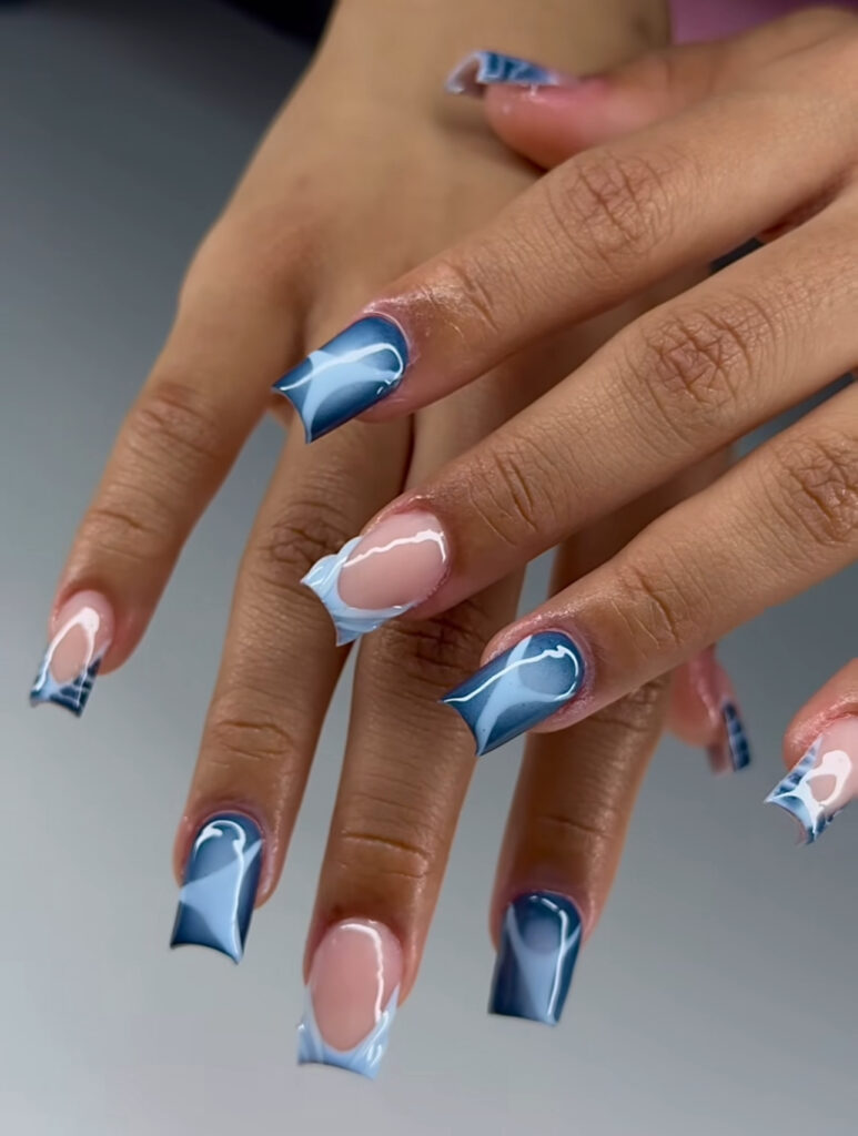 Smoky blue French tips create a water like marbled effect using white and dark blue shades.