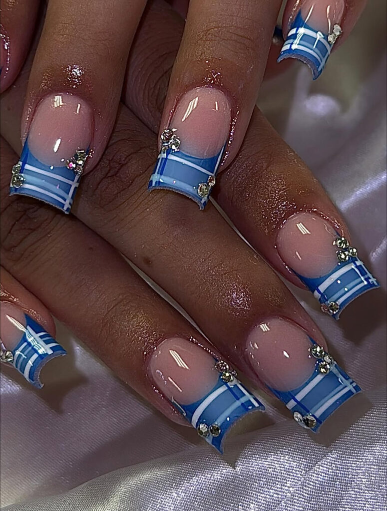 These French tips feature blue and white plaid patterns with small clear rhinestones along the smile line.