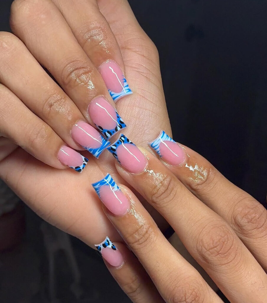 These vibrant blue animal print French tips combine light blue swirls with bold leopard style spots. The design looks trendy and fearless.