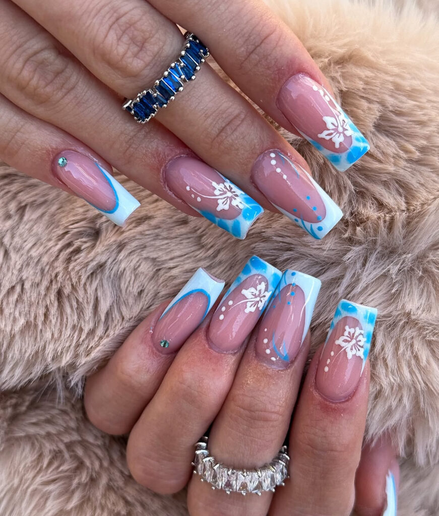 These medium blue French tips feature delicate white hibiscus flowers, subtle dots, and wavy lines.