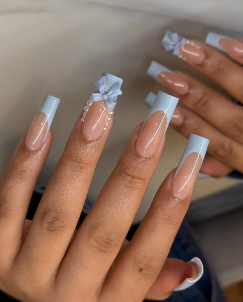 These pastel blue French tips feature a glossy nude base with a 3D light blue bow and pearl accents. It feels soft, feminine, and slightly playful.