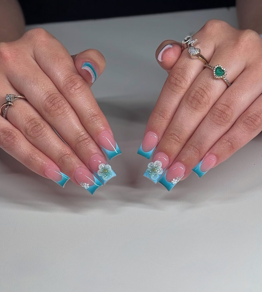 These vibrant blue ombré tips get elevated with 3D white and blue flowers and center set jewels. The gradient blends beautifully into the nude base.