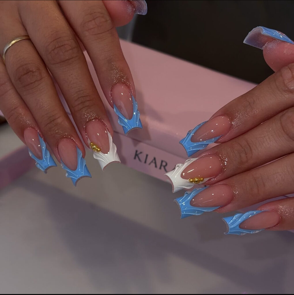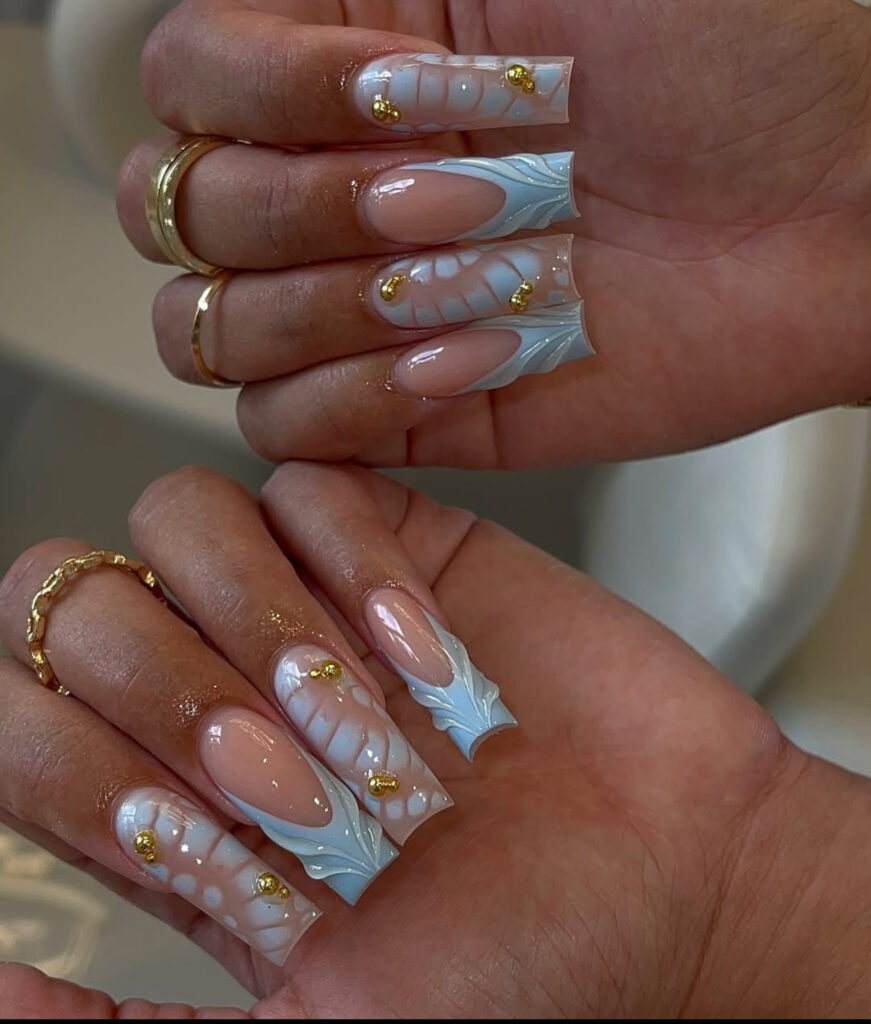These nails combine a nude base with 3D pale blue textures, intricate white detailing, and gold bead accents. The result? A luxurious French tip twist that looks expensive.