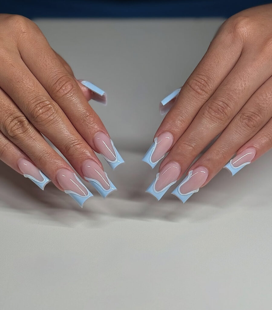 These long square nails feature baby blue French tips outlined with a crisp white wavy border. The nude base keeps everything clean and modern.