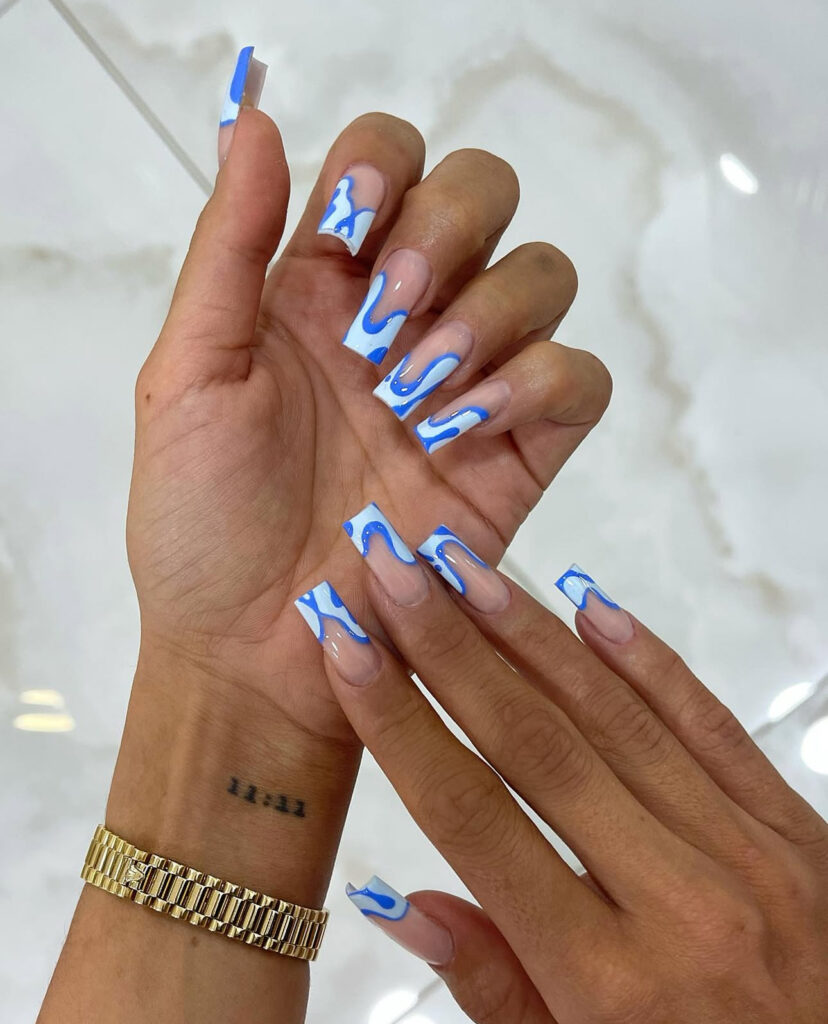 These long, square shaped nails feature a nude base with abstract blue swirls and wavy French tips. The mix of vibrant blue and light blue creates movement that feels creative and intentional.