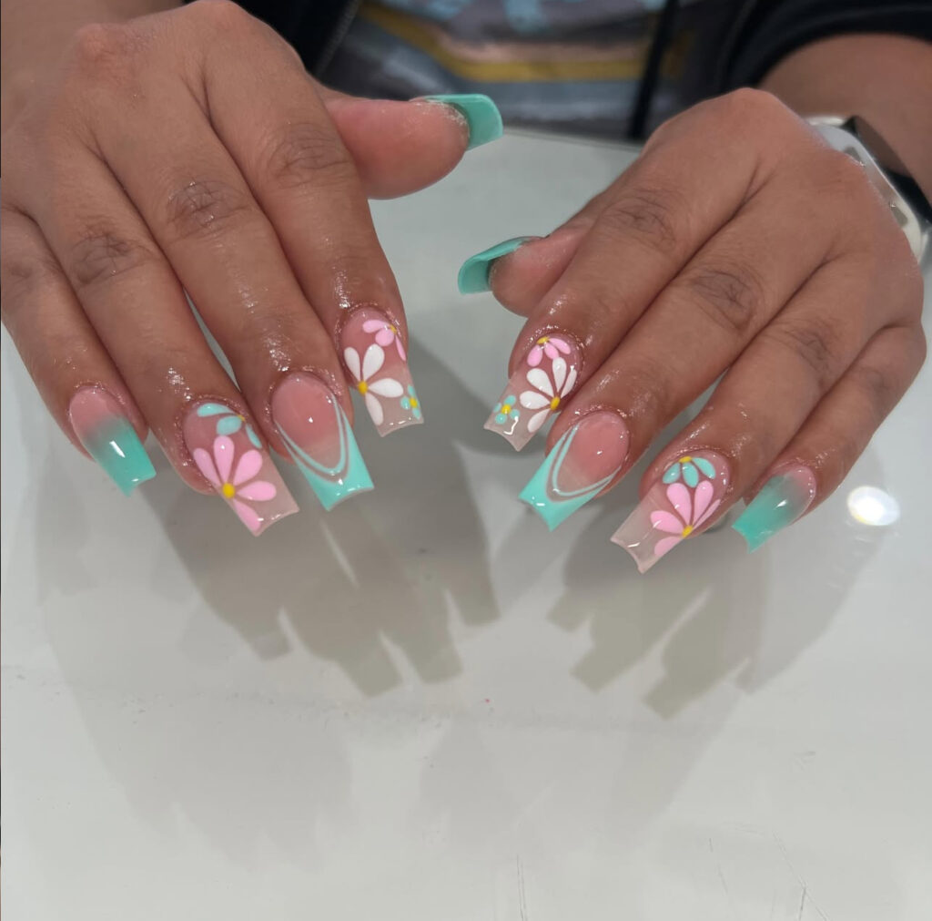 It features mint green ombre nails, double French tips, and oversized pink and white floral art. The combination looks fresh and playful.