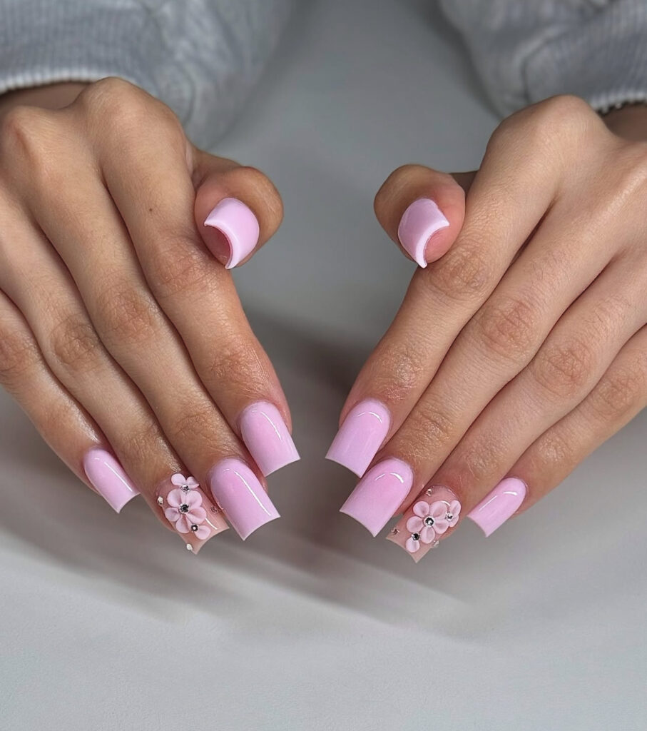 This manicure uses a soft baby pink base and adds 3D floral accents and tiny rhinestones for extra charm.