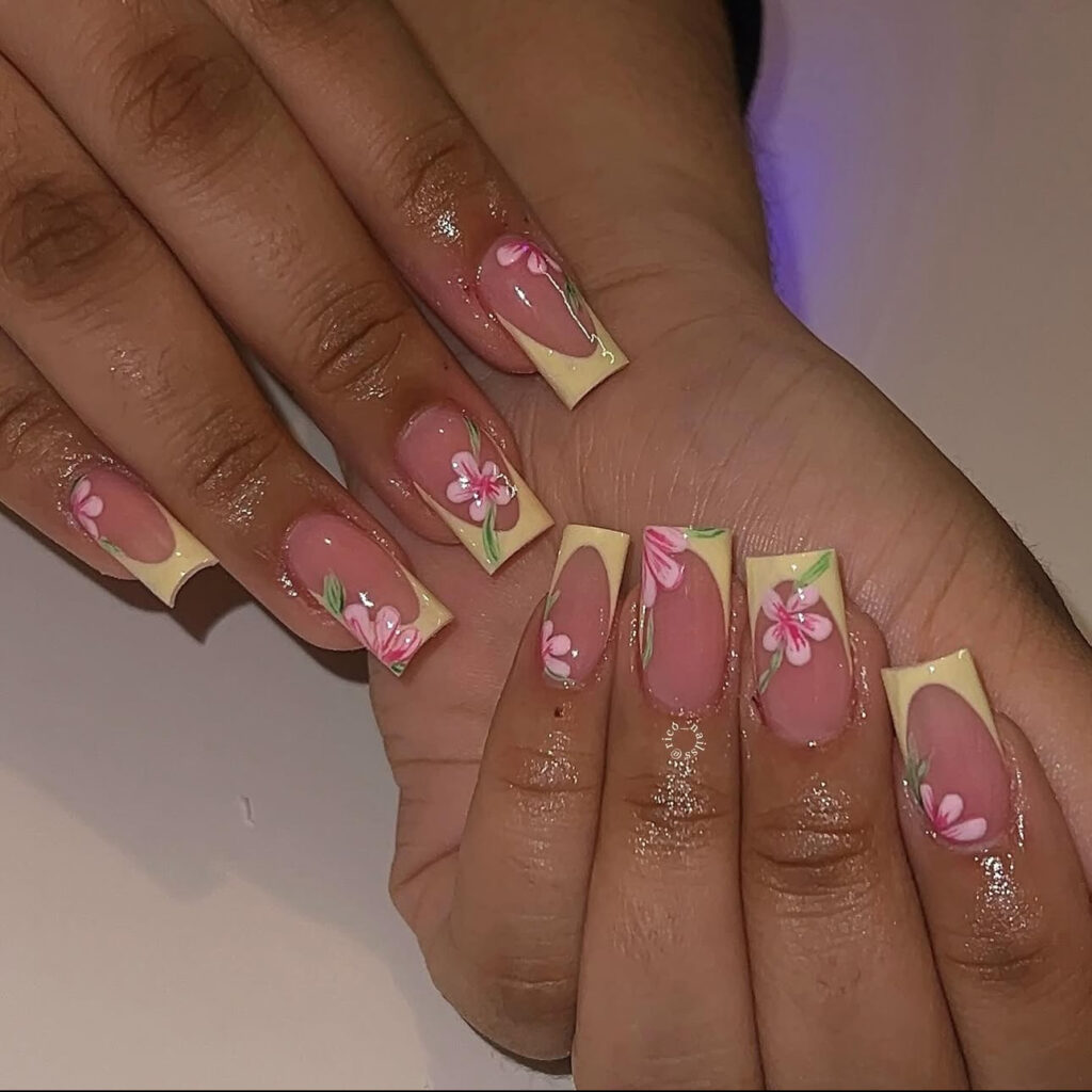 These nails feature creamy yellow French tips decorated with pink flowers and tiny green leaves. The colors feel warm and natural.