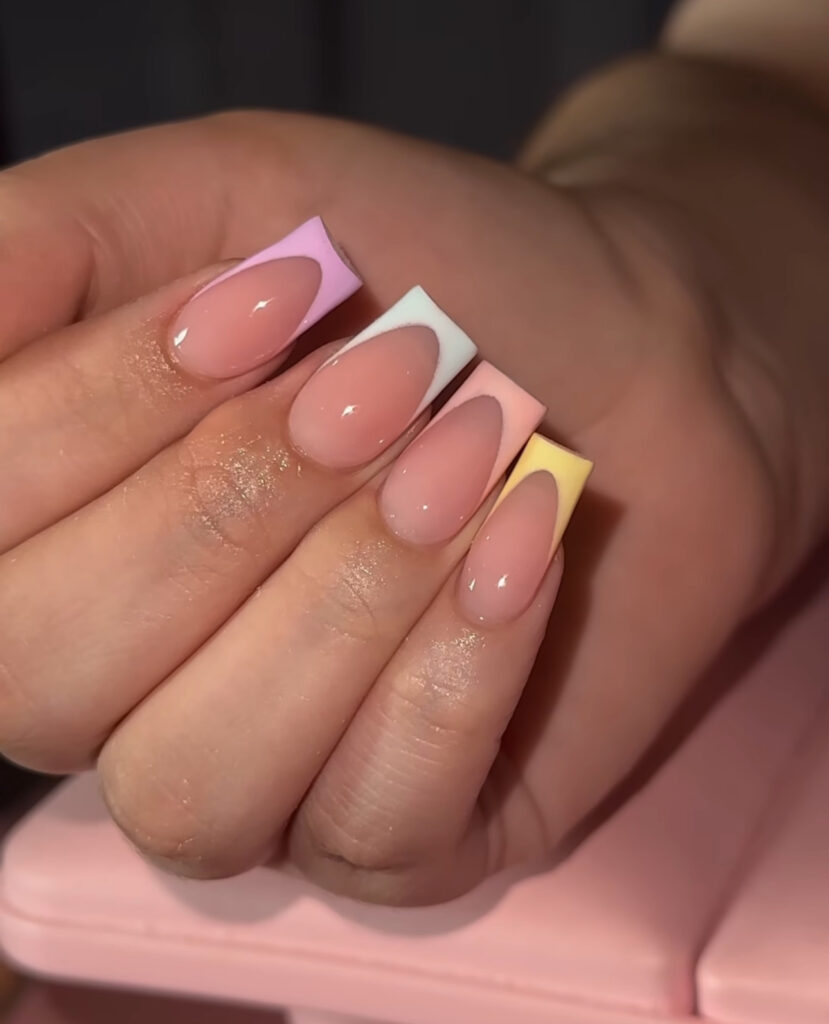 Each nail features a different pastel French tip color like lavender, peach, white, and yellow. The variety looks fun but still feels clean.