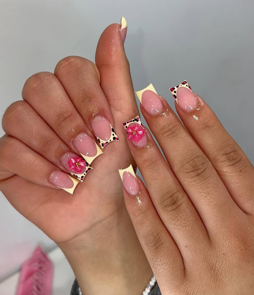 It combines creamy French tips, leopard print accents, and bold 3D pink hibiscus flowers. The mix of wild patterns and fresh florals creates a unique manicure.