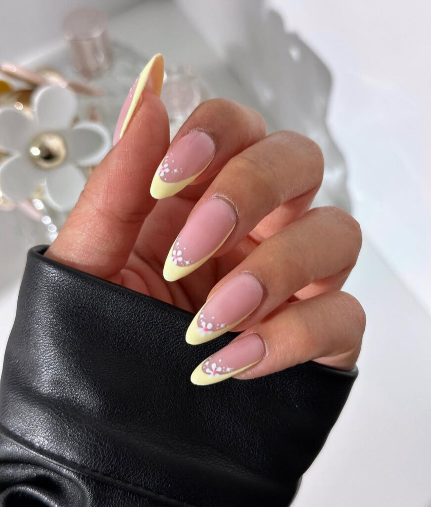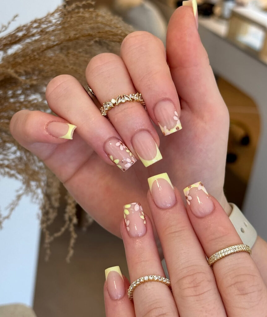 These nails use pastel yellow French tips and add tiny white and pink flowers for a minimalist floral effect. The design feels soft and delicate.
