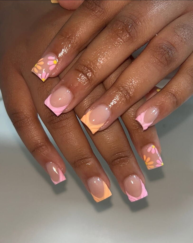 This manicure uses pink and orange waves along the tips, paired with matching floral accents. The colors feel warm, playful, and cheerful.