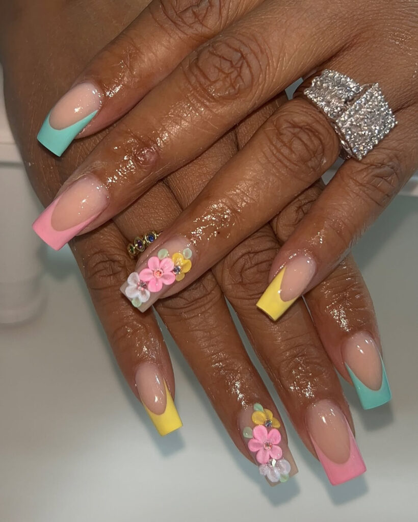It combines pastel French tips in different shades with a clear accent nail decorated with 3D floral charms.