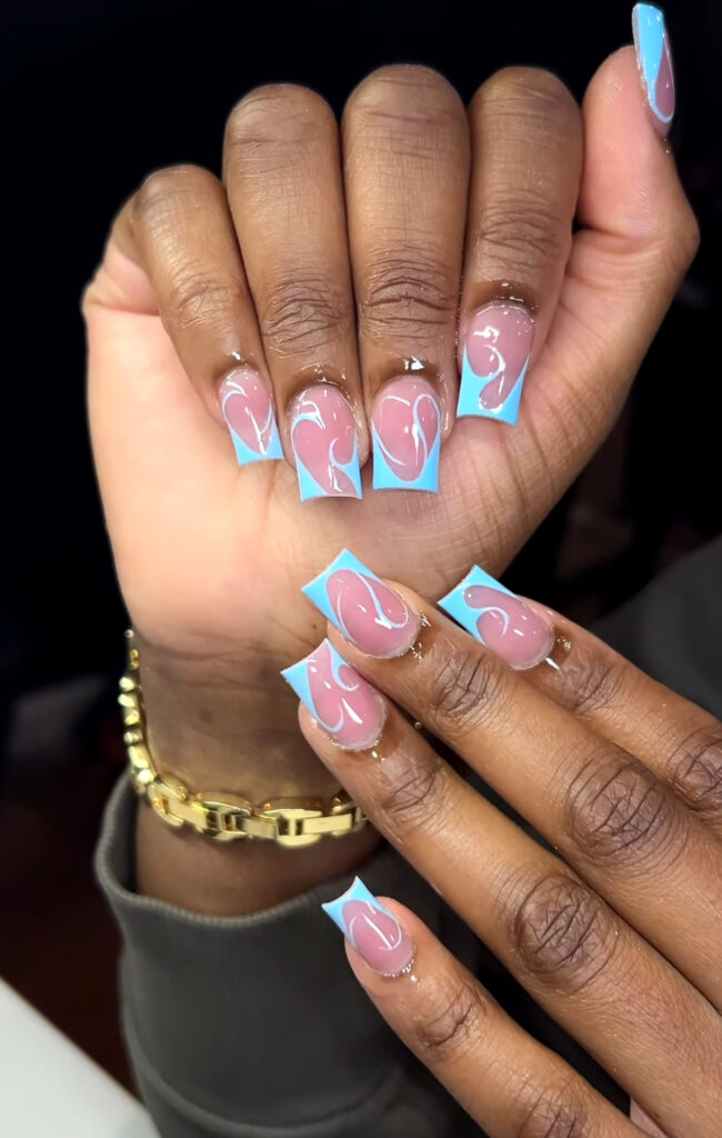 Want something slightly bold but still simple? Sky blue French tips with abstract heart swirls offer a fun twist.