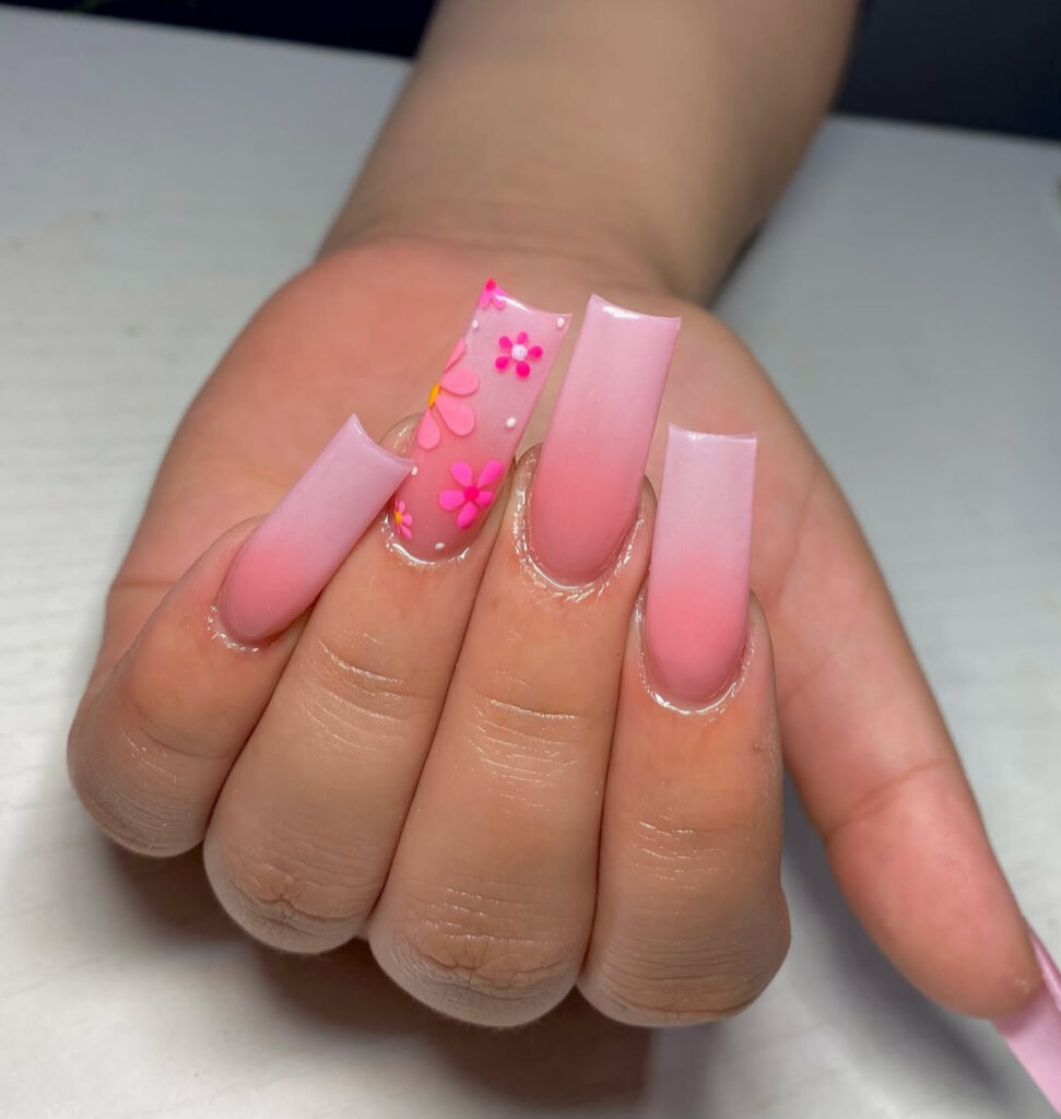 This design blends soft pink shades across the nails and finishes the look with a vibrant hot pink and orange floral accent. The contrast keeps the manicure playful and energetic.
